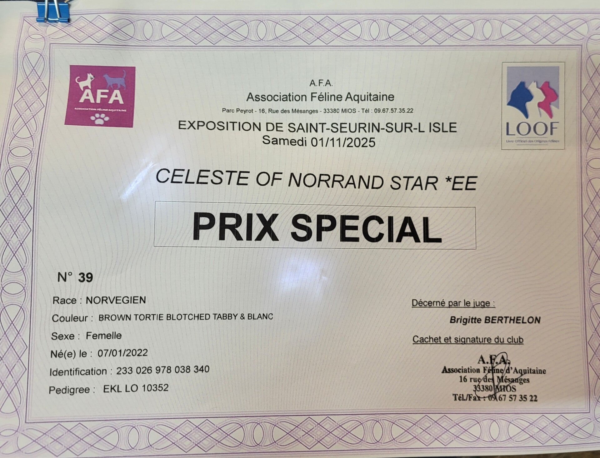 Le 01/11/2025 Prix spécial, Ex1, Nominé Best In Show, Best in Show, Best of Best CAGCI, Juge: Mme Brigitte BERTHELON.